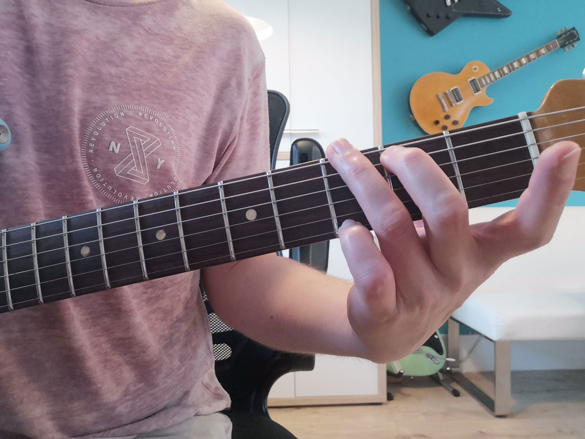 Hardcore jazzers will play this chord by hooking their thumb over the neck to play the bass note, but we’ve chosen a fingering friendlier to small hands.
