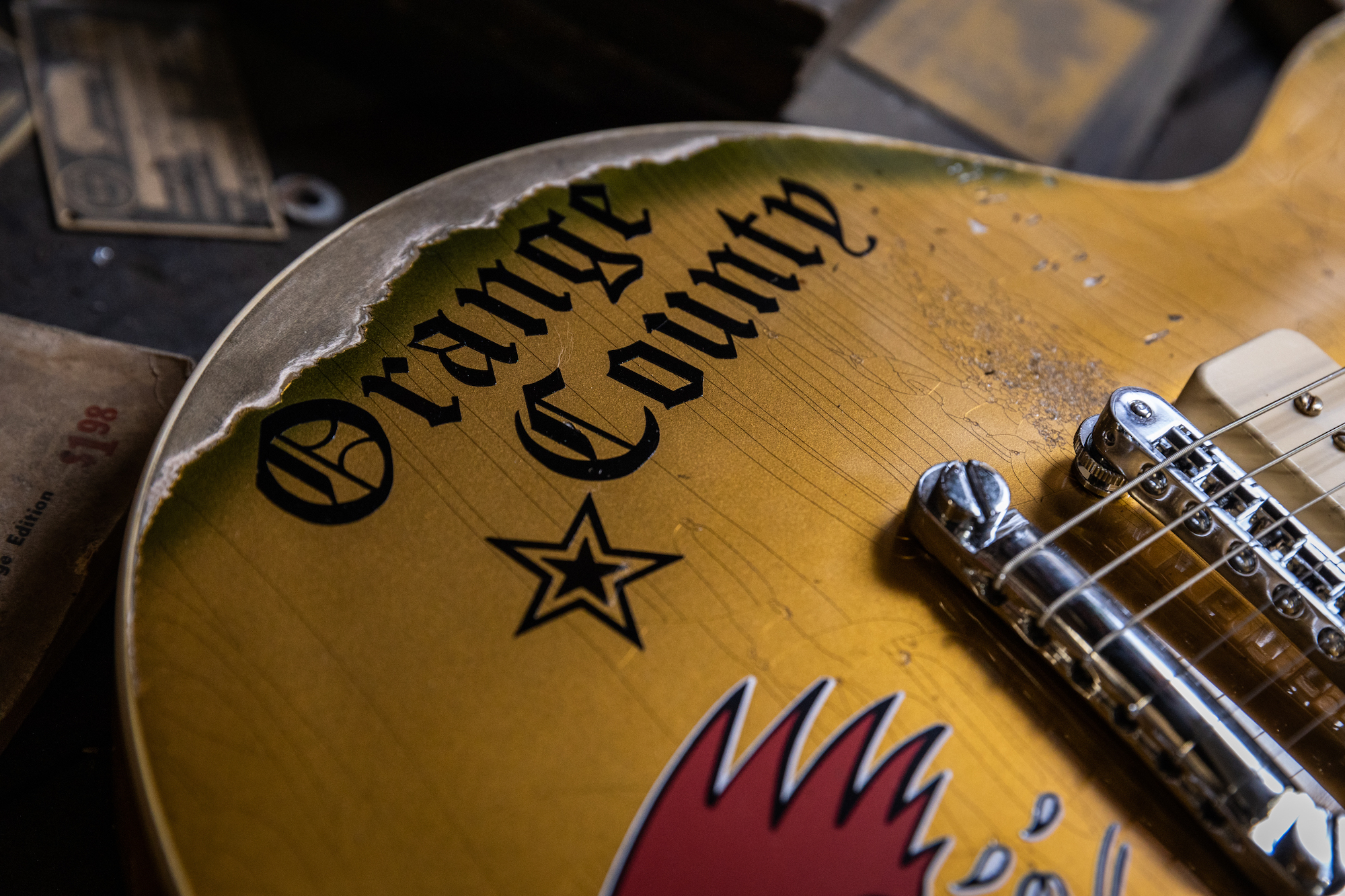 The guitar's nickel hardware has also been given the aging treatment, as have the gold-top-hat-with-silver-insert control knobs.