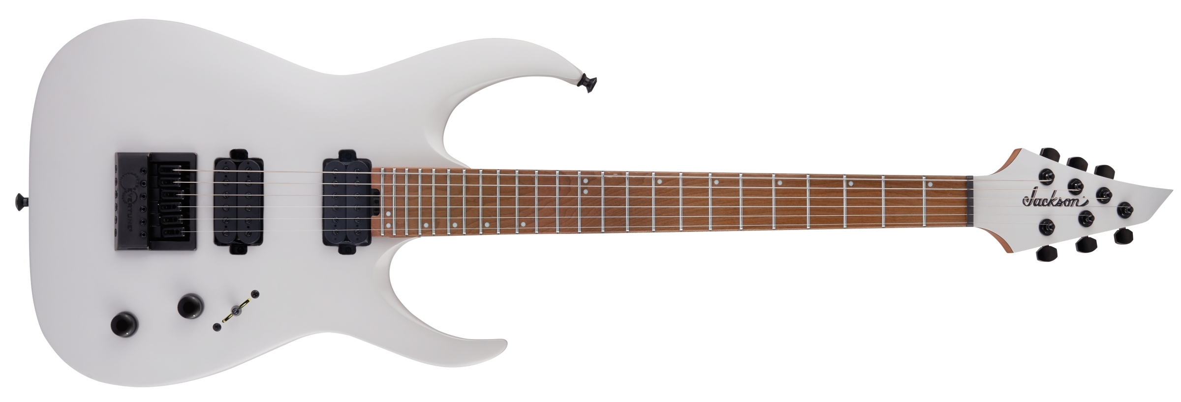 Other features include a basswood body, bolt-on caramelized maple neck with graphite reinforcement, scarf joint and oiled back finish, 20”-radius caramelized maple fingerboard with rolled edges, 24 jumbo frets and offset white dot inlays, uncovered direct-mount Jackson MM1 pickups, five-position pickup blade switch, single volume control and single tone control with push/pull select.