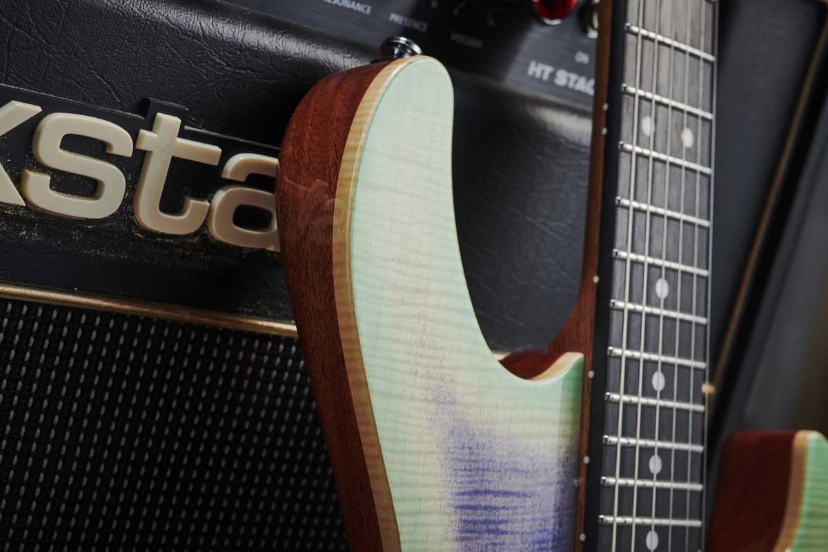 The standard model features a flame maple-topped swamp-ash body and bolt-on birdseye maple neck and fingerboard. Our LE is packing a flame maple top on an African-mahogany back. That top is a 7mm slice of AAAA flame maple. That’s two more As than the Bisto Kids used to describe their gravy. That’s how tasty this guitar’s top looks, too.