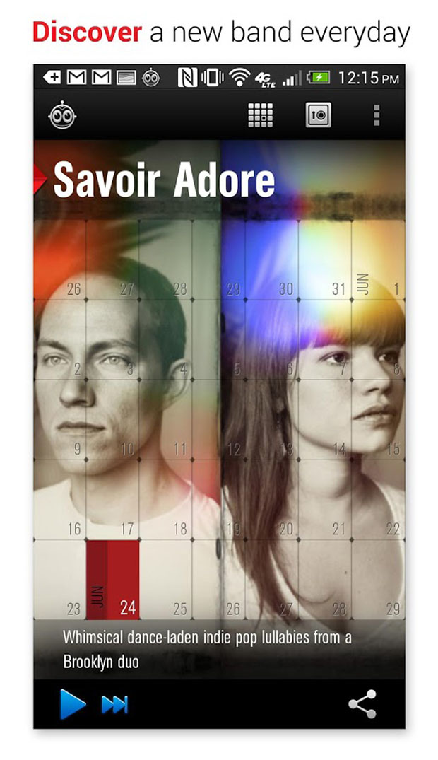 Band of the Day for Android features a stunning user interface which reveals just one expertly-curated artist a day, every single day, in a calendar-like grid. Users are also able to listen to a selection of full-play songs (commercial-free and uninterrupted), read band biographies, view videos and photographs, and share new discoveries with their social networks. Completely unique to the Android version is the ability to easily browse through a list of archived bands, and unlock content from over 800 previously-featured artists.