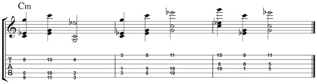 In order to build the next group of triads, you take the major shapes from the previous examples, 1-3-5, and lower the 3rd by a 1/2 step, forming a minor triad, 1-b3-5. From there you raise the highest note in each inversion to produce the minor version of the spread triad shapes that we saw in the previous major examples.