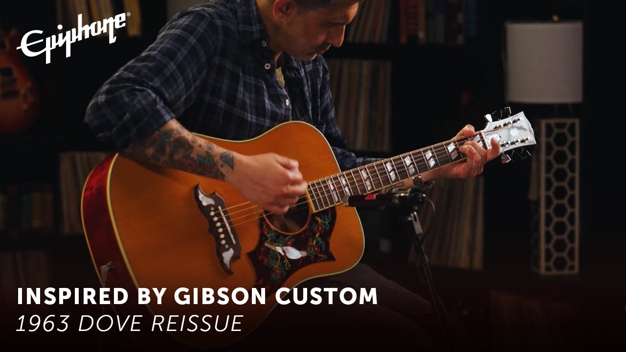 Our third glimpse into Gibson’s acoustic past comes in the form of the Dove. First introduced in 1962 as the company’s second square-shoulder acoustic, our Epiphone model is, according to the spec, “a stunningly authentic recreation of the iconic early Dove models from 1963”. Why not 1962? That’s not clear.