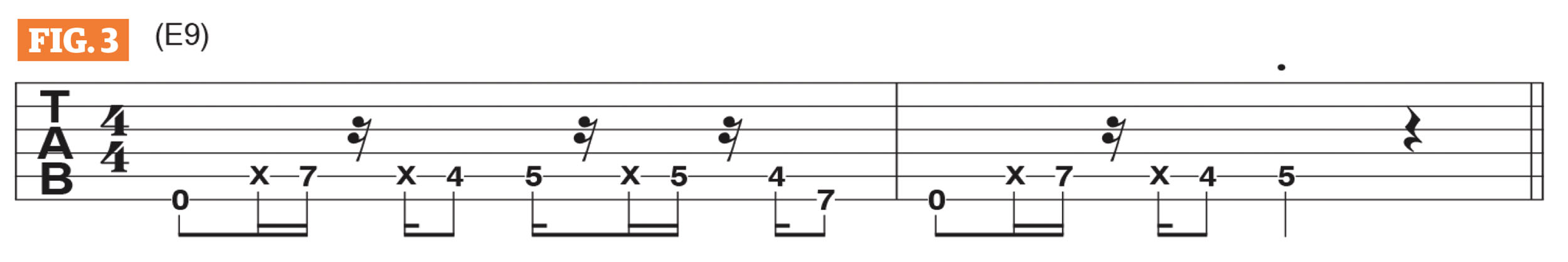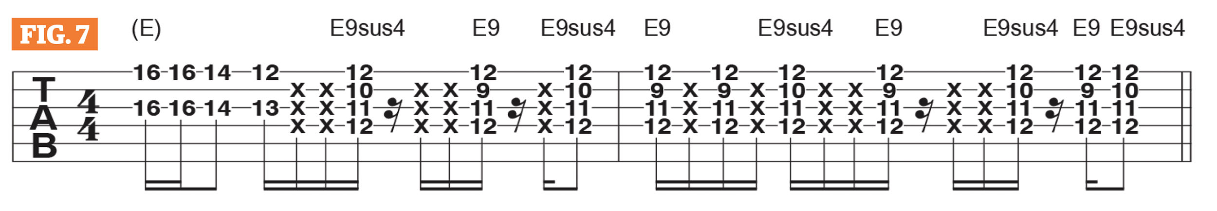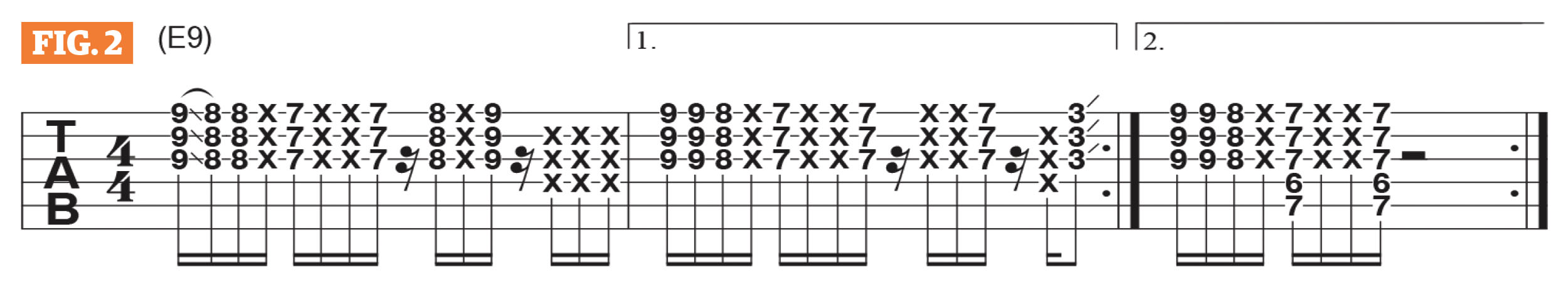 Figure 2 illustrates Mark’s rhythm guitar part for the tune’s first “verse.” It’s is based on a 7th-position E9 chord shape, and the top three strings are strummed and move down from a 9th-fret barre, sounding E6, to a passing-chord at the 8th fret then to E9 at the 7th fret.