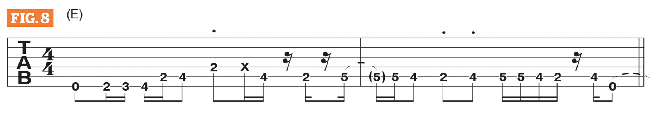 After repeating the initial riff, we move to the second ”verse,” for which Mark switches to a rhythm part based around an E7#9 chord, not unlike Shining Star by Earth, Wind & Fire. Then, midway through the verse, we play a different line in unison, which is based on the E minor pentatonic scale (E, G, A, B, D), shown in Figure 5.