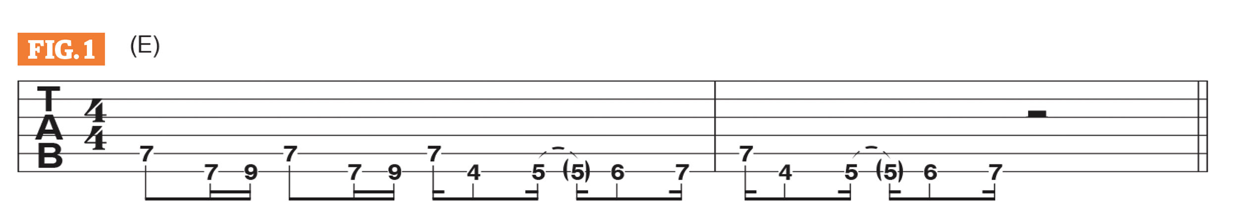 The tune starts with a primary bassline-like riff, shown here in Figure 1, which is based on the E major pentatonic scale (E, F#, G#, B, C#) with some syncopated chromaticism happening on the low E string. Compositionally, that’s actually the most important part of the tune.