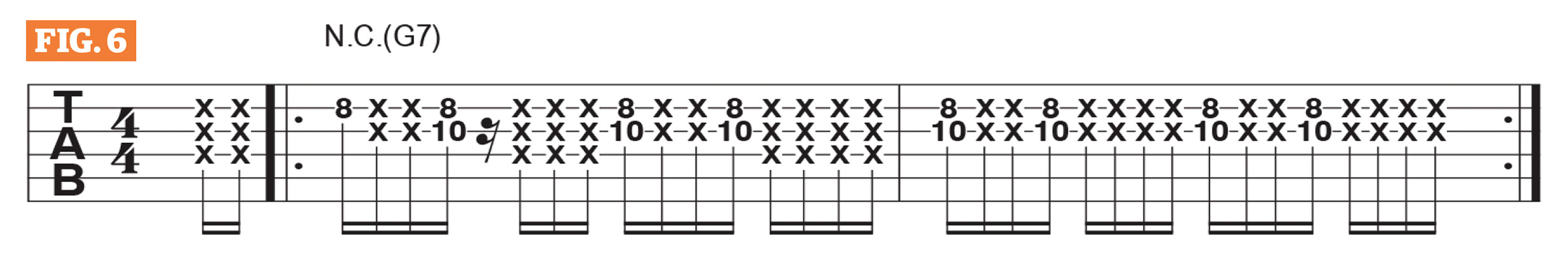 A great part to add now is something along the lines of a shaker or hi-hat accenting straight 16th notes throughout. Figure 6 is played in this way, devised of muted-string accents along with the interval of 2nds, sounded with F and G notes.