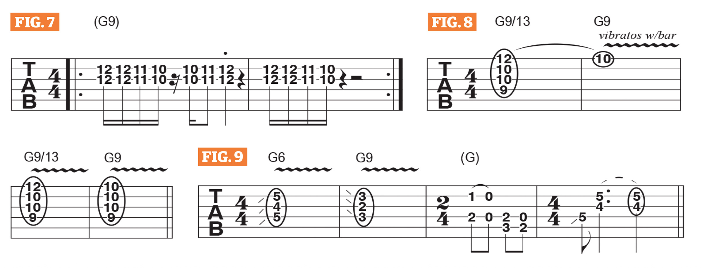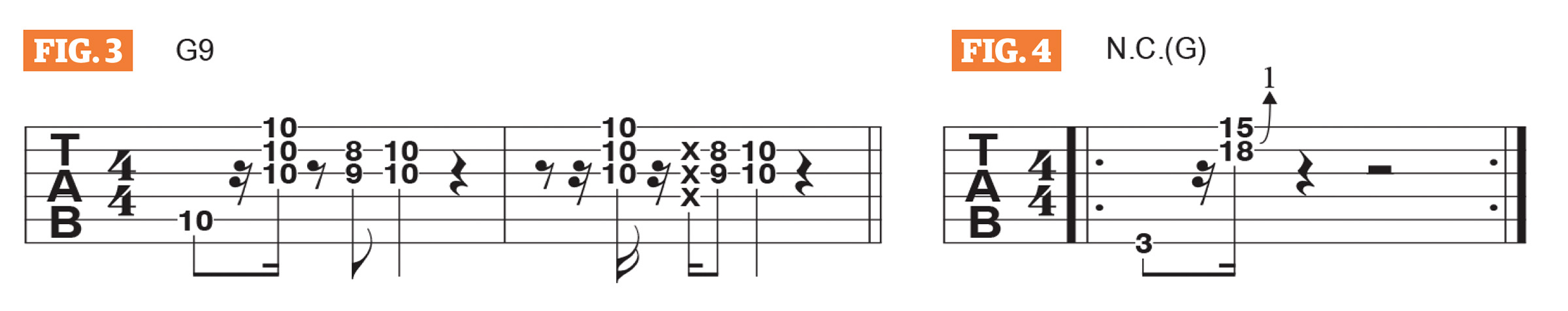 A great way to add to these two parts is to virtually double Figure 2 an octave higher. As shown in Figure 3, I begin each bar with a quick accent on G9, followed by the same two-note shapes 3rds apart, played one octave above the previous part.