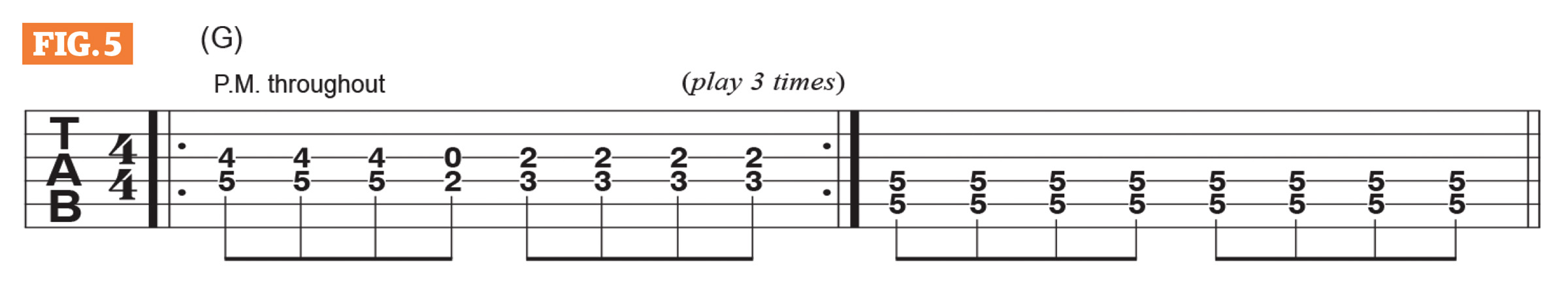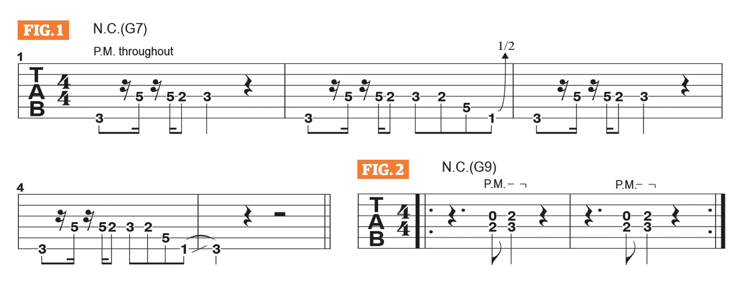 At this point, with all these guitars outlining the rhythmic foundation, it’s good to add a more melodic part, like Figure 7. Here, I play 3rds on the G and B strings, descending and then ascending one fret at a time. Also, I’m getting a pizzicato violin-like sound by using palm-muted downstrokes.