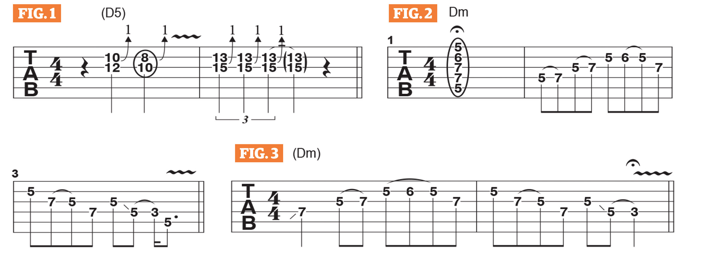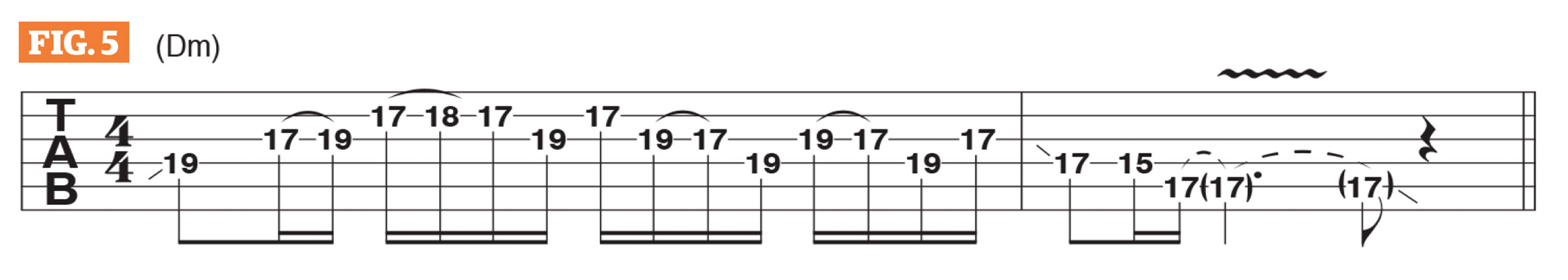 As shown in Figures 2 and 3, over a Dm chord, I like to move up and down the D minor pentatonic scale (D, F, G, A, C) with the inclusion of the 2nd, or 9th, E, articulating the line with an abundance of hammer ons, pull offs and finger slides.
