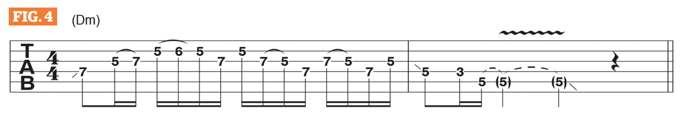 The solo section is played at a slow tempo with a heavy feel, so it sounds great to ramp up the intensity by playing these sequences in a rhythm of 16th notes, as shown in Figure 4.