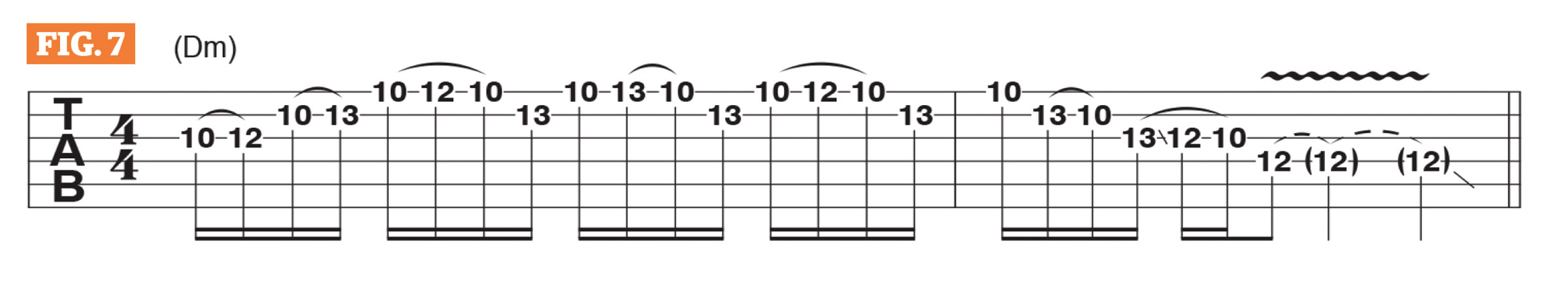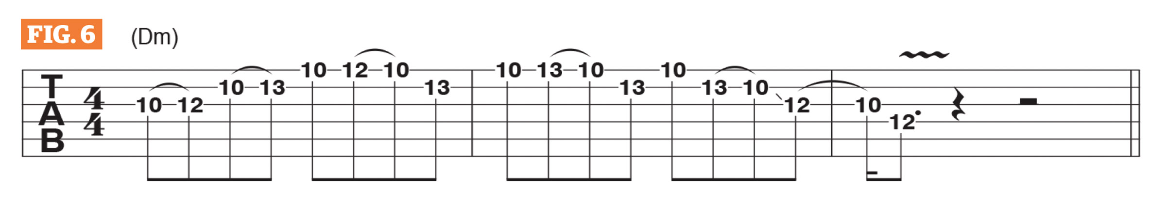 In Figure 6, I play a similar phrase, also based on D minor pentatonic with the inclusion of the 2nd/9th, E, but played here in a slower rhythm of eighth notes and in 10th position.