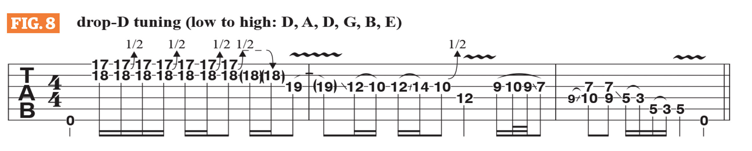 Any “country-style” sounds will work great here, too. Since we-re tuned to drop D, I’ll strike the open low D string and play two-note Figures, 3rds apart, adding subtle bends, as in Figure 8.