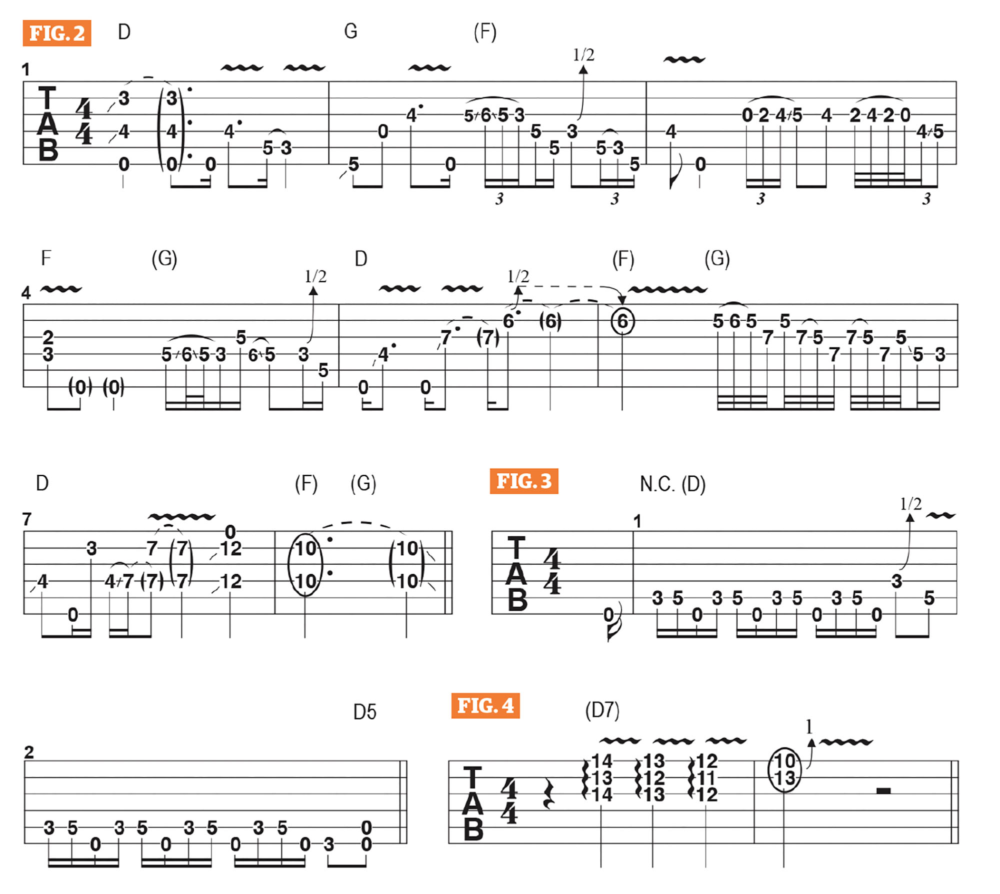 As shown in Figure 2, I slide into fretted F# and D notes, sounded along with the open low D, then move to G followed by a single-note riff that’s based on the D blues scale (D, F, G, Ab, A, C).