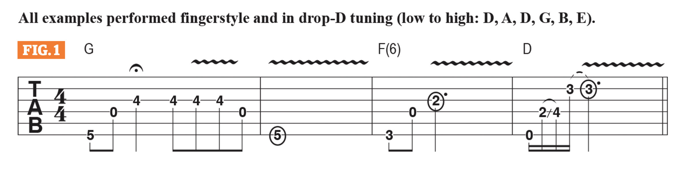 One way I accomplish this is to keep an open D string in the mix for all of the voicings. As shown in Figure 1, I play a G chord by fretting the low G on the 6th string’s 5th fret, played along with the open 4th string and a B note at the 4th fret on the G string.