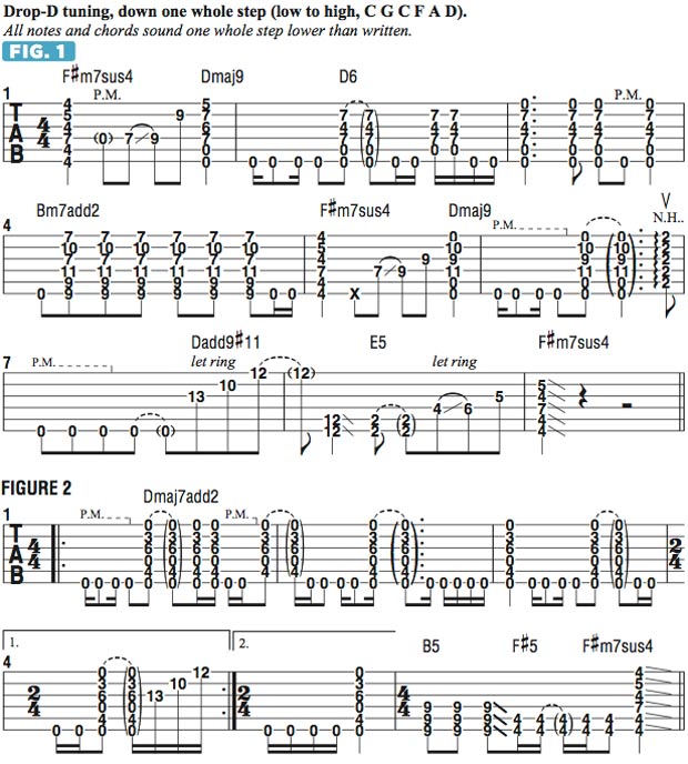 FIGURE 1 illustrates the verse riff, following the initial 16-bar phrase. This figure is another example of my penchant for writing riffs and patterns that are based around a chord progression: I came up the progression first—F#m7-Dmaj7-Bm7—and then went about formulating an interesting and unexpected way to connect the chords while also incorporating unusual and unexpected rhythmic syncopations. The first chord is actually F#m7sus4, and I love the way the notes on the D, G and B strings sound when played next to each other like this.