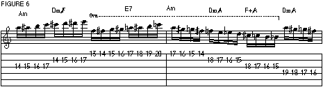This piece is played at an extremely fast tempo, and the last thing you want to do is break your right-hand rhythm worrying if the next note lands on an upstroke or downstroke. Keep in mind that you can "borrow" melodic ideas from this piece and incorporate them into your own solos. For example, the second measure can be used as a great connecting line from one A minor-pentatonic or blues lick to another. Experiment using other lines from this piece.