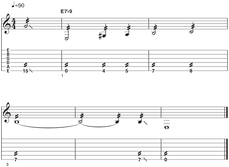 This style requires more wrist mobility and a looser picking grip, like a funk rhythm guitarist. The result? Ambient washes, punchy cacophony, and ethereal richness. In this example, there's a set of 'false notes' - two of the same exact pitch played on two different strings simultaneously. This adds thickness and dissonance as the C note on the third string is slowly raised by a ¼ step.