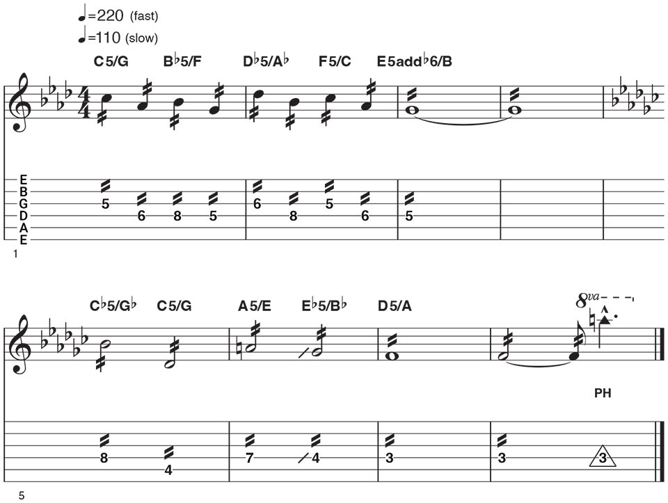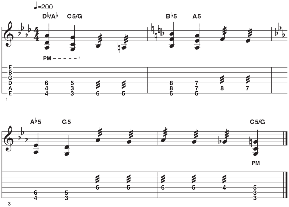 As stated earlier, keep your pick angle sharp not flat contact to the string but angled so each stroke has less resistance. Practice in short bursts to avoid hand stress as 200 bpm with constant tremolo is intense. This example is a great workout for tone control and switching between muted chords and high-octane single note runs.