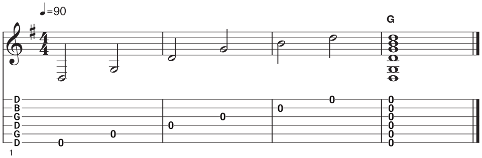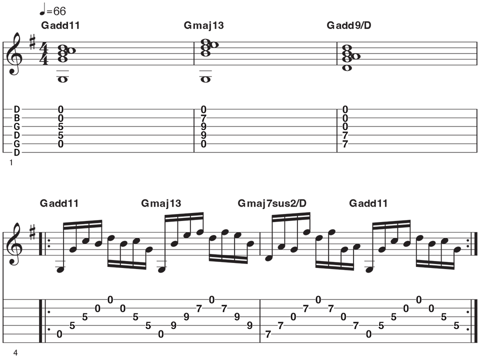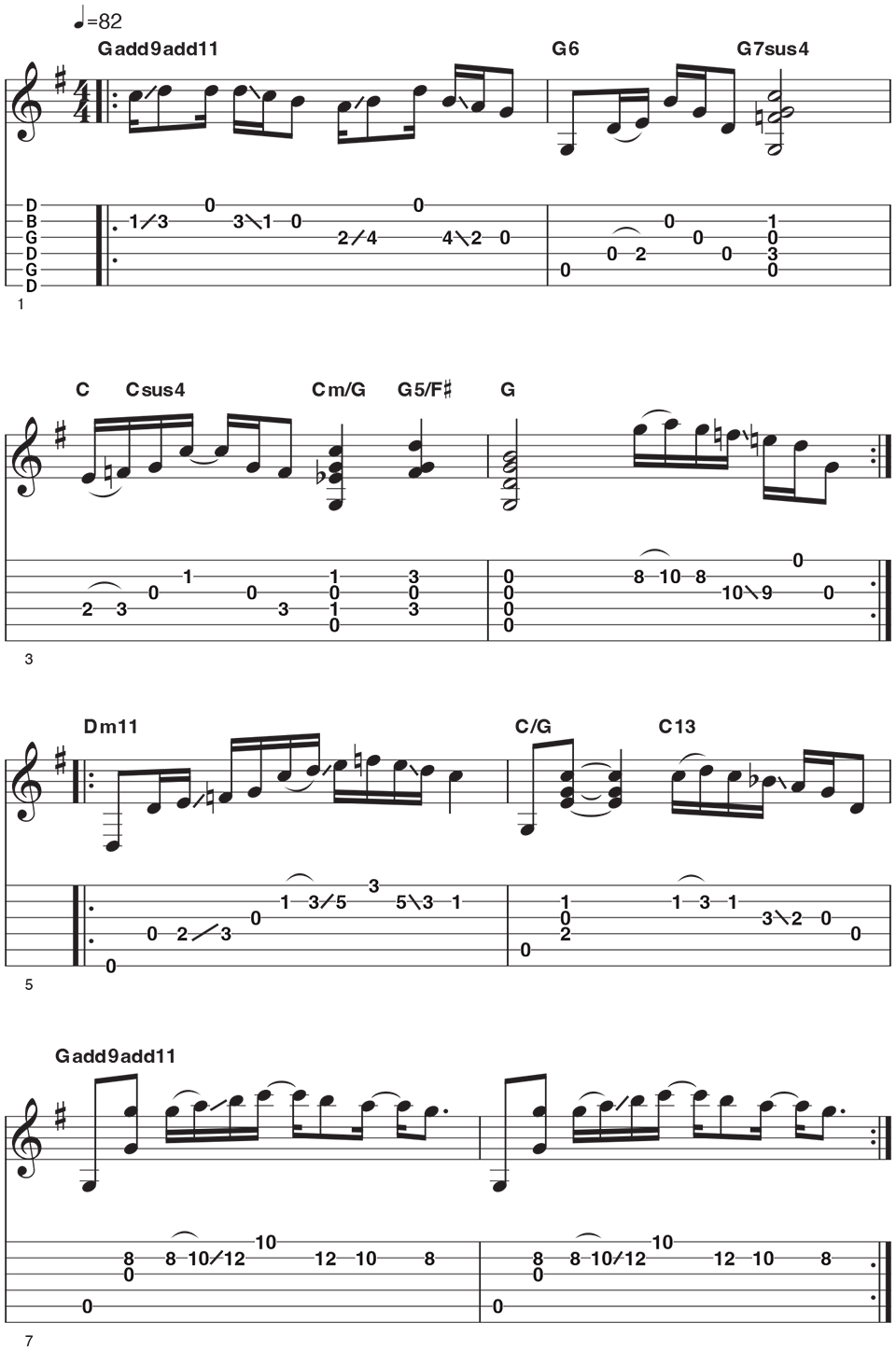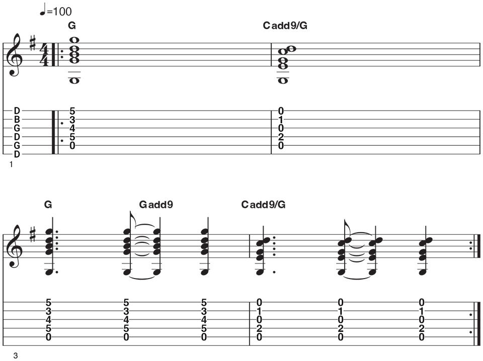 Next you can start locating simple open major and minor chords and find out where chord progressions such as I – IV and I – IV – V lie. In this example, you’ll play G (the I chord) to C (the IV chord) progression. Listen how the open fourth string (D) at the top of the C chord creates a rich add9 extension.
