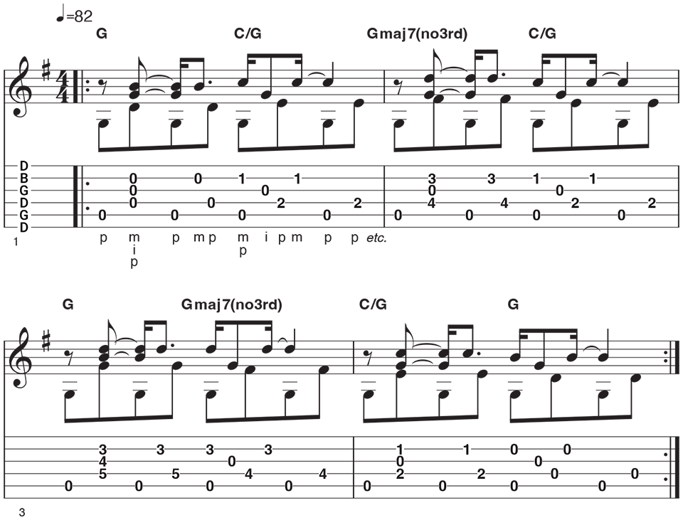 Open G can take some of the work from the fretting hand as the open strings do so much. In this fingerpicking example you’ll play through the I – IV – V chords in G major (G - C - D). Check out how the chords require very few fretting hand fingers, a nice relief!