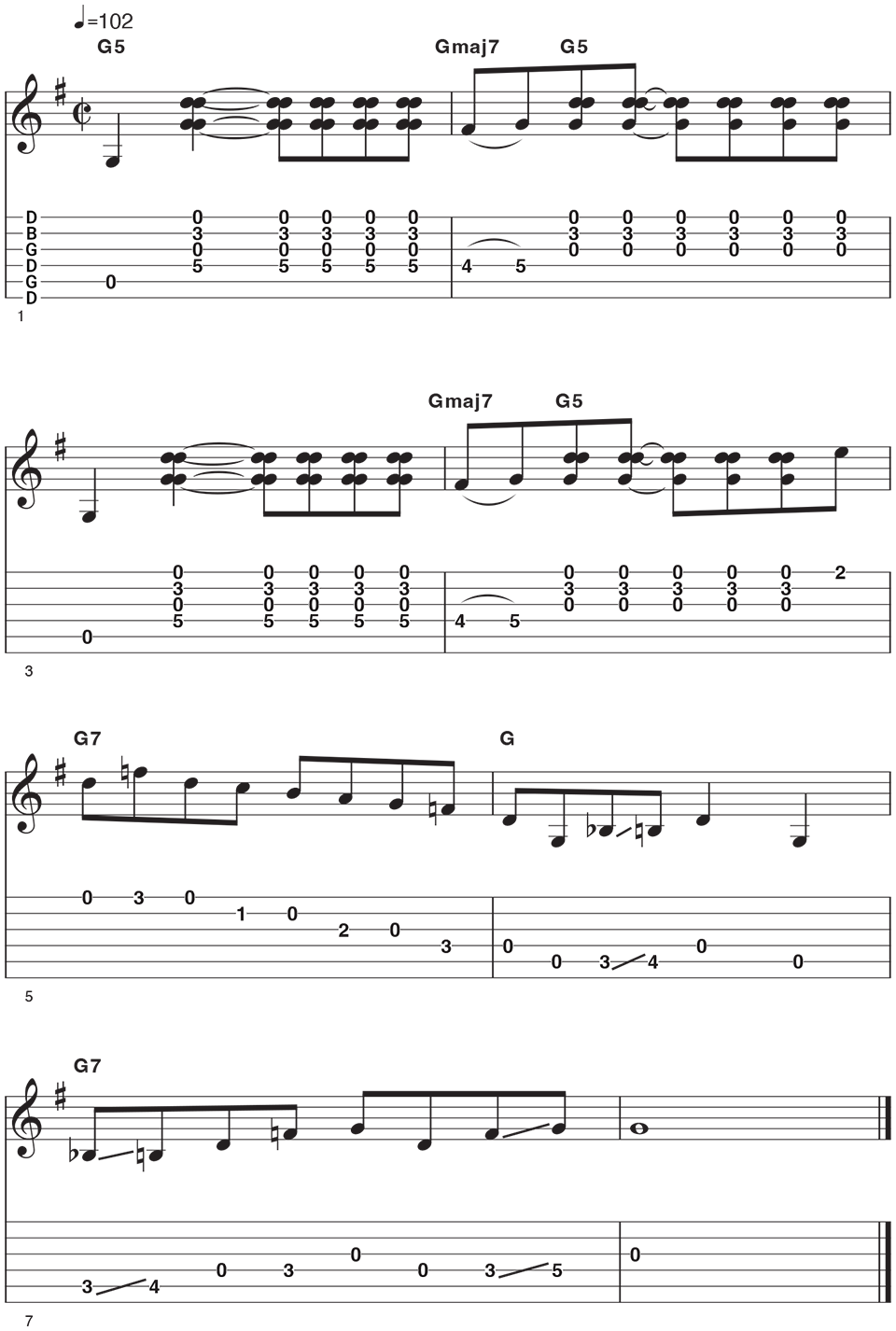 In bar 1, the G5 chord has two G notes and two D notes, sounding like a variation on a 12-string guitar.