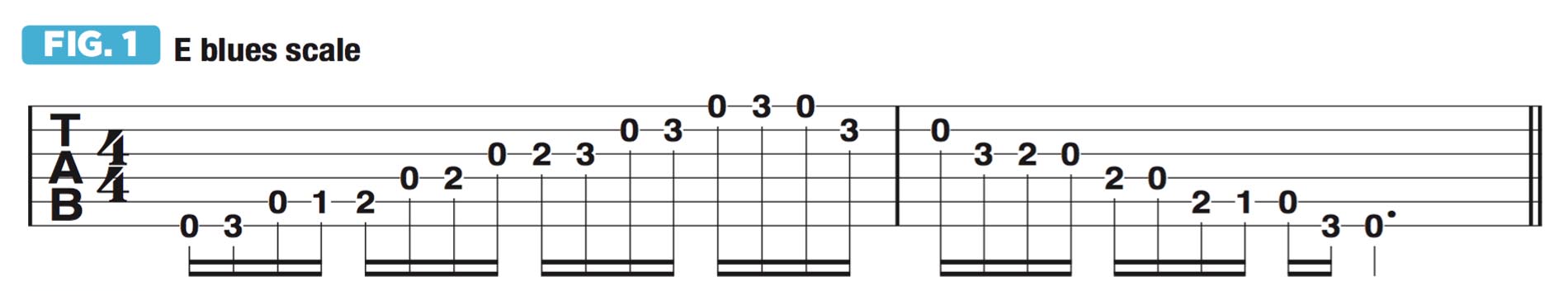 Let’s begin with a lick based on the E blues scale (E, G, A, Bb, B, D). Figure 1 illustrates the scale played in 1st, or “open,” position.