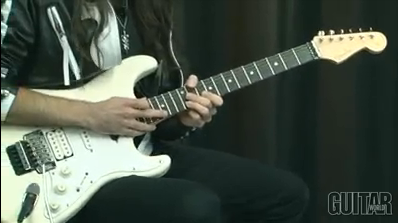This leads into the final section, beginning in bar 4. I continue with F#dim7 arpeggios and incorporate tapping on the top three strings and some fret-hand "hammer-ons from nowhere." The lick ends with a high tap-and-bend, followed by a release and pull-off to the fret hand, after which I add finger vibrato.