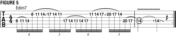 In FIGURE 3, I begin in the same manner as FIGURE 1 but then slide up to the next higher position of Edim7 and then move back down to the G string. I slide up again when returning to the high E string as the line continues. FIGURE 4 offers the same pattern but in reverse.