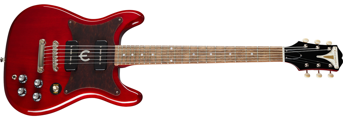 Like the Coronet, it features a double-cutaway mahogany body, but boasts a pair of those Epiphone Pro P-90 Soapbars, adjusted via two tone controls, and two volume knobs.