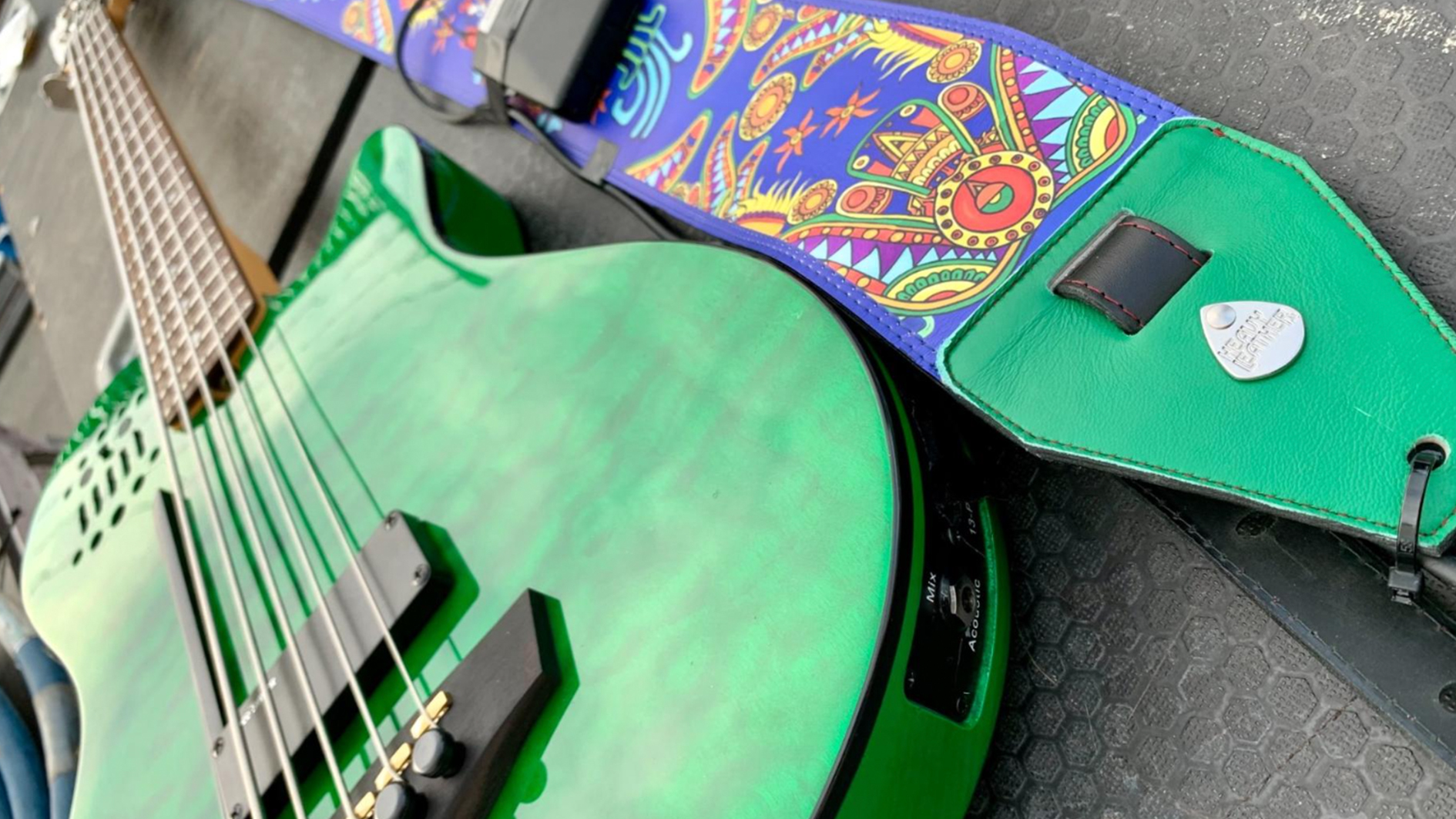 The bass – a one-of-a-kind, custom-built Godin A5 Ultra 5-string specially built and donated for the event – features a two-chambered silver leaf maple body with a Trans Green-finished flame maple top, a rock maple neck with a rosewood fingerboard and a Lace Sensor low profile electric pickup.