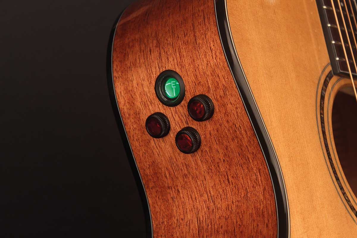 The built-in electronic system is a Fishman Flex Blend with chromatic tuner and internal electret-condenser cardioid microphone. The controls (tone with phase button, blend and volume with tuner button) and LED tuner display are mounted on the side.
